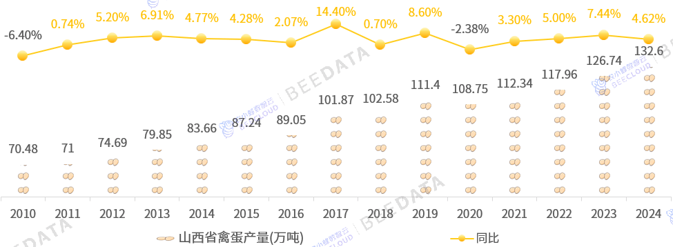 2024年,山西省肉类产量为169。5万吨,同比增加了9。36%,此中,猪肉产量为109。2万吨、占比64。42%,同比增加了9。69%;牛肉产量为11。7万吨、占比6。9%,同比增加了14。37%;羊肉产量为12。8万吨、占比7。55%,同比增加了7。11%;禽肉产量为35。9万吨、占比21。18%,同比增加了10。12%。据山西省统计局数据显示,2010~2024年间,山西省禽蛋产量由70。48万吨波动增加至132。6万吨,近14年间增加了62。12万吨、增幅约88。14%、年均复合增加率约4。62%。其间,仅2010年、2020年呈现过小幅同比下降现象。产量规模常年位列全国第9位。