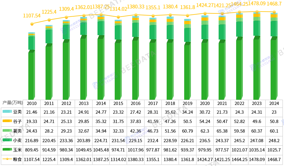 细分品类来看,次要粮食做物常年呈现“玉米小麦薯类谷子豆类”的产量布局,此中,玉米产量占比常年正在65%以上。
